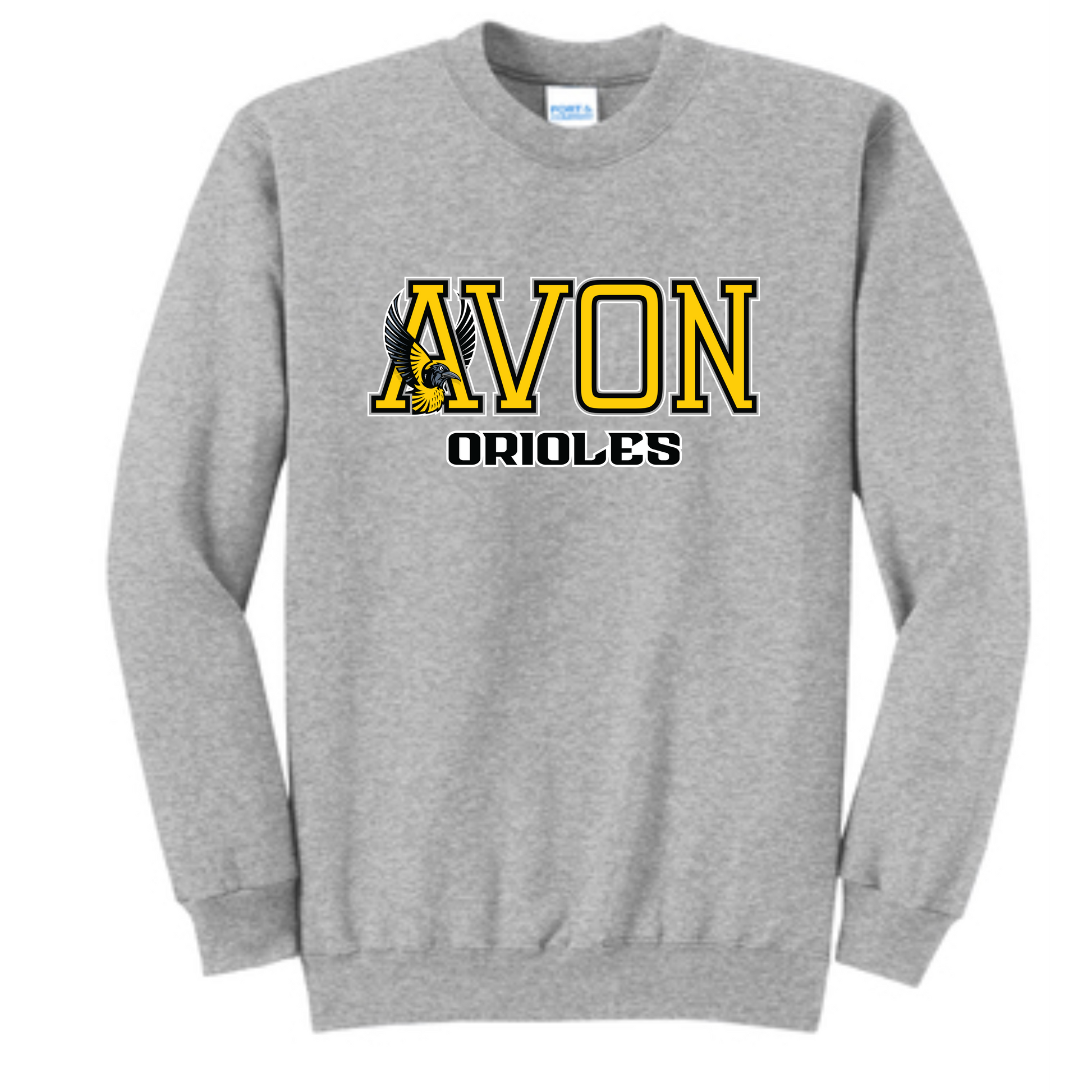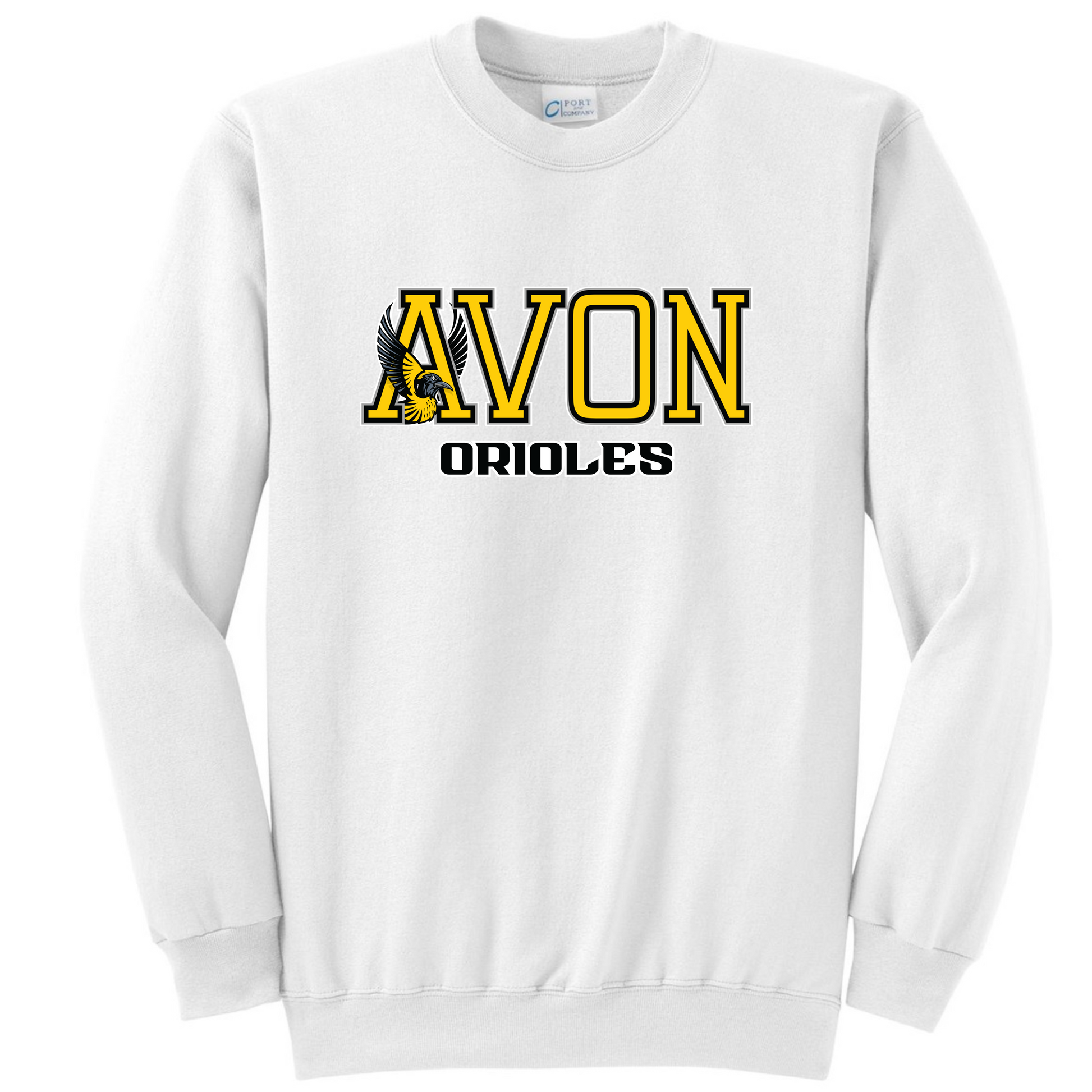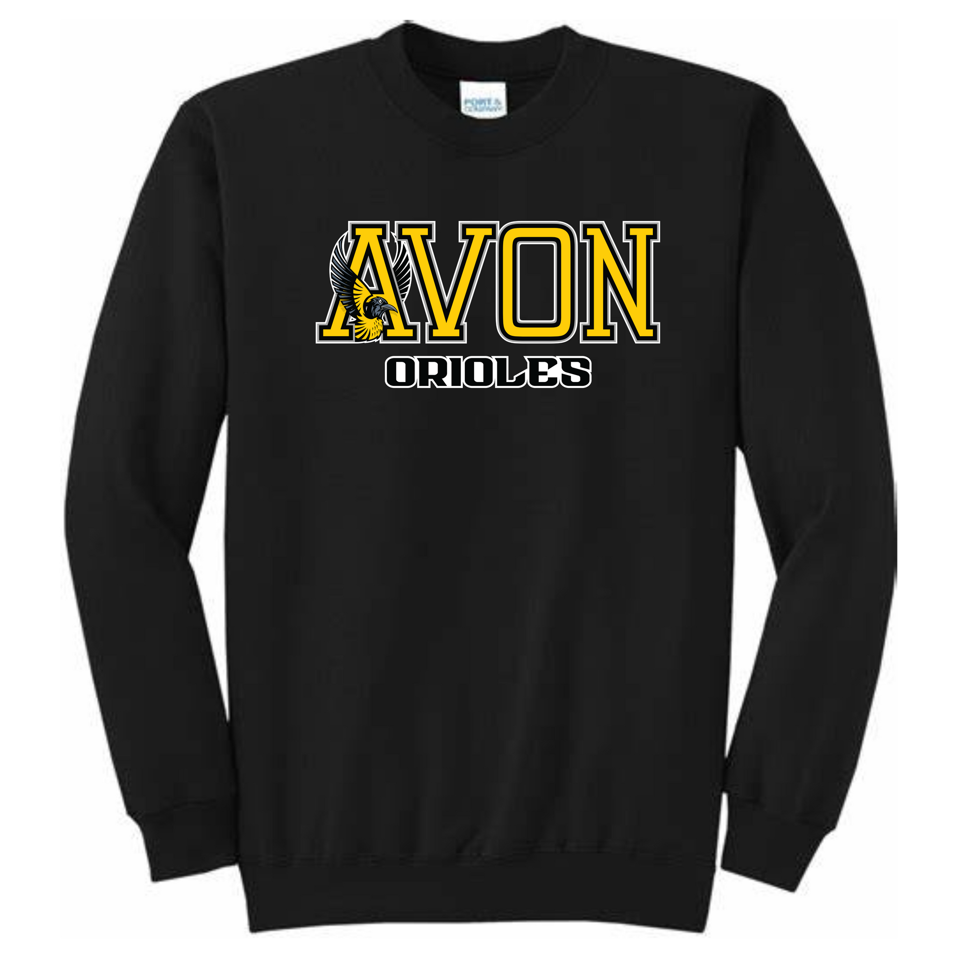 Hey hey Orioles, this crew is available in adult and youth sizes, black, white, or athletic heather. It features the horizontal Avon Orioles logo on the front of the sweatshirt. Both adult and youth sweatshirt brands are Port & Company, which is a midweight, fleece lined crewneck. Sizes run slightly oversized.