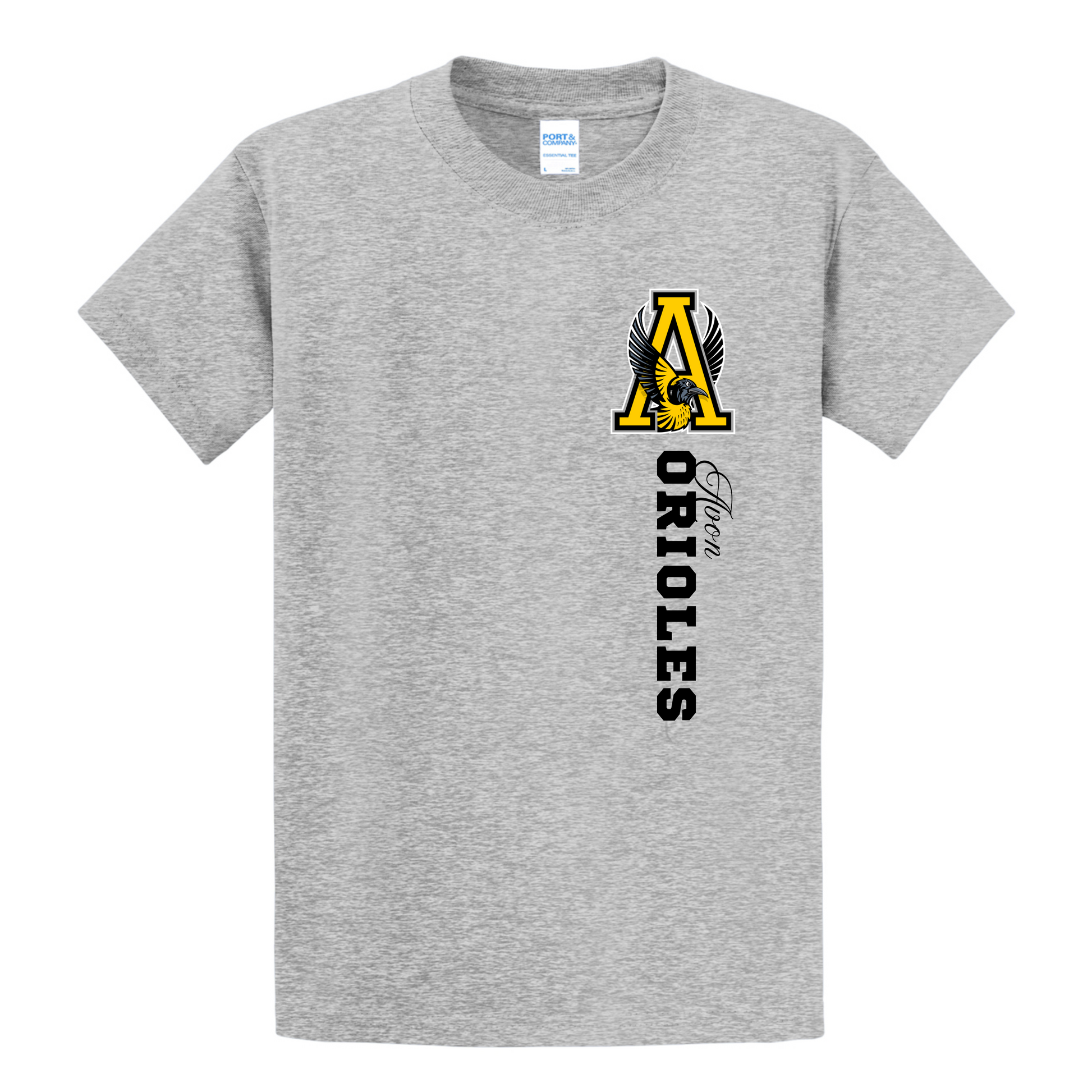 Youth: Gildan Dryblend (50/50 poly cotton tee) ash gray.