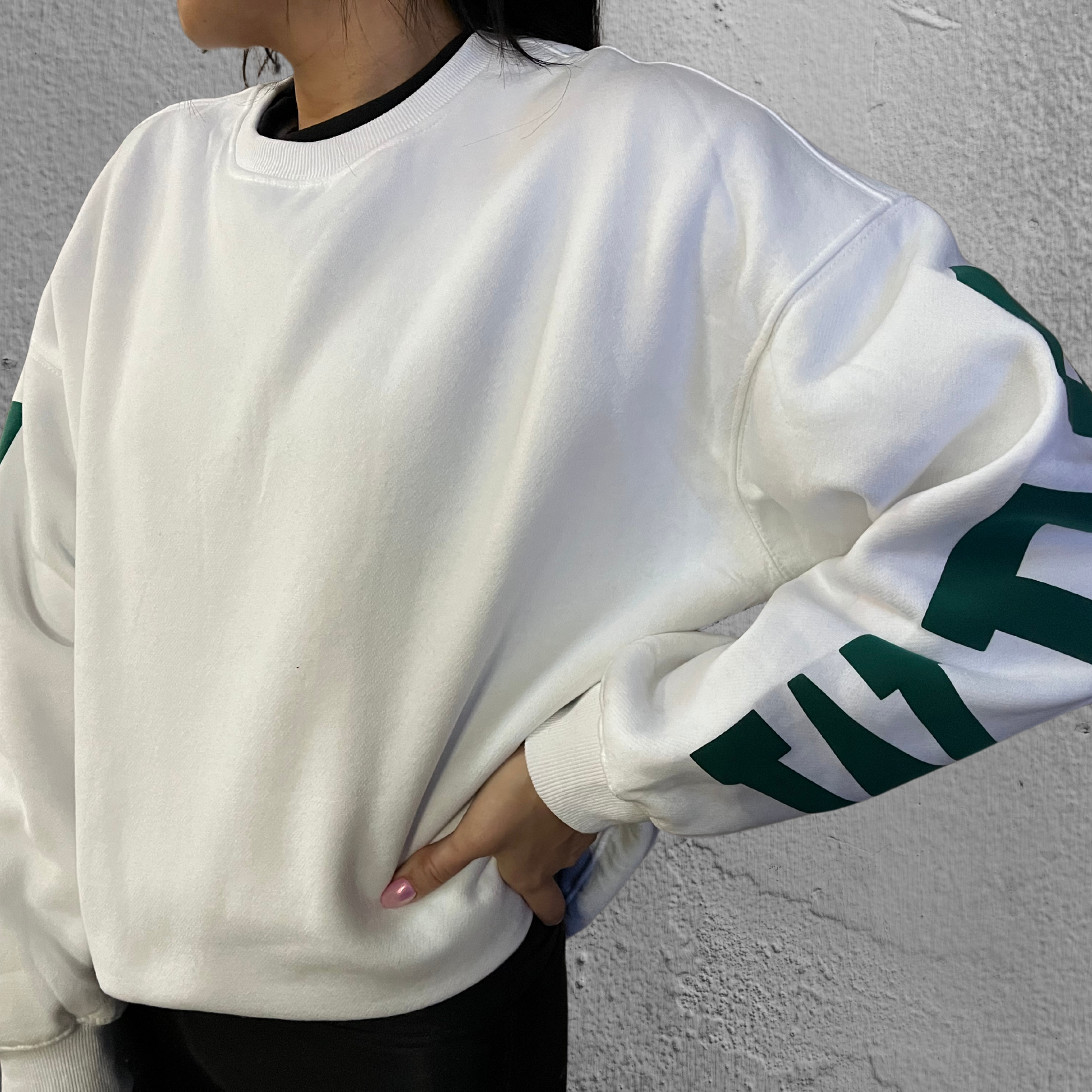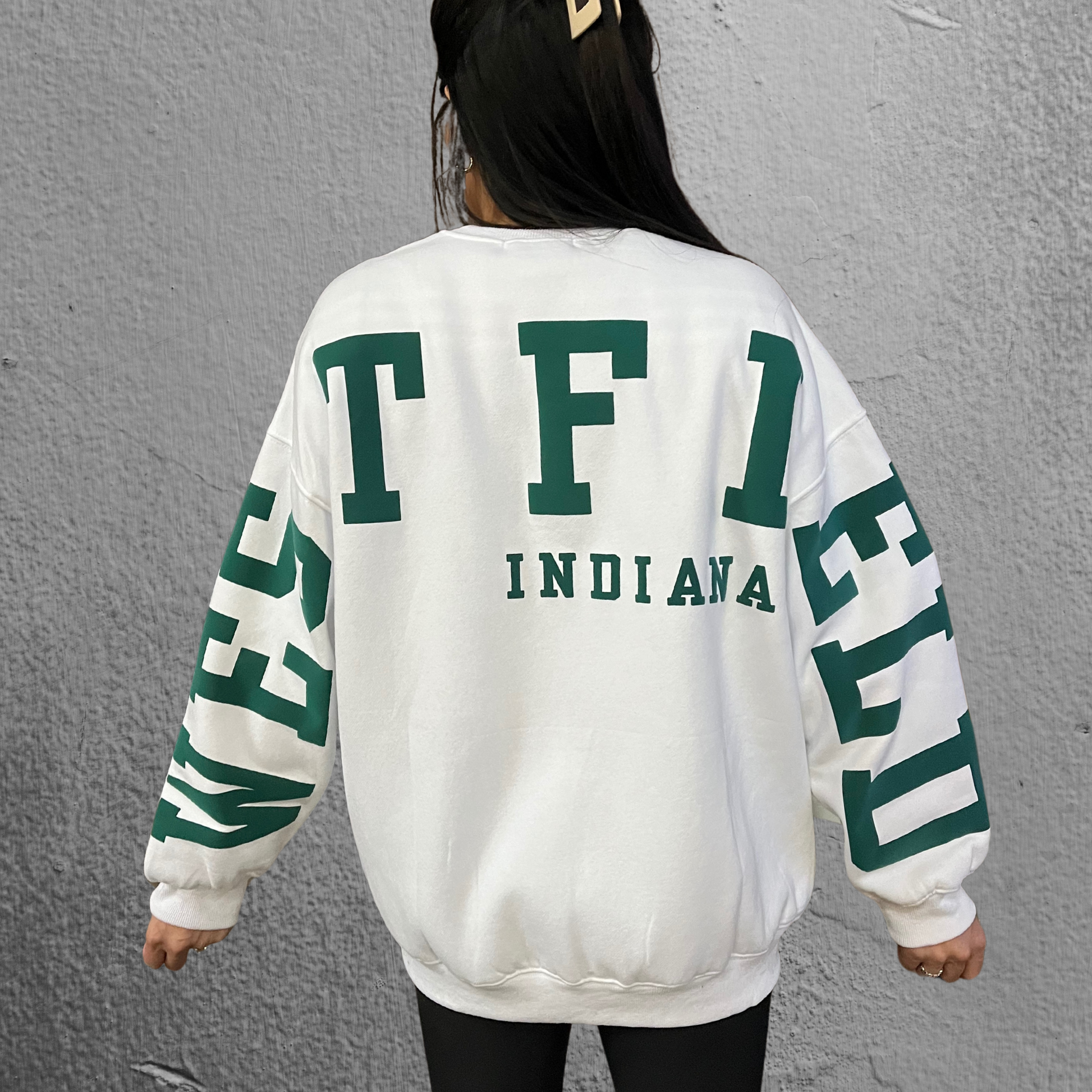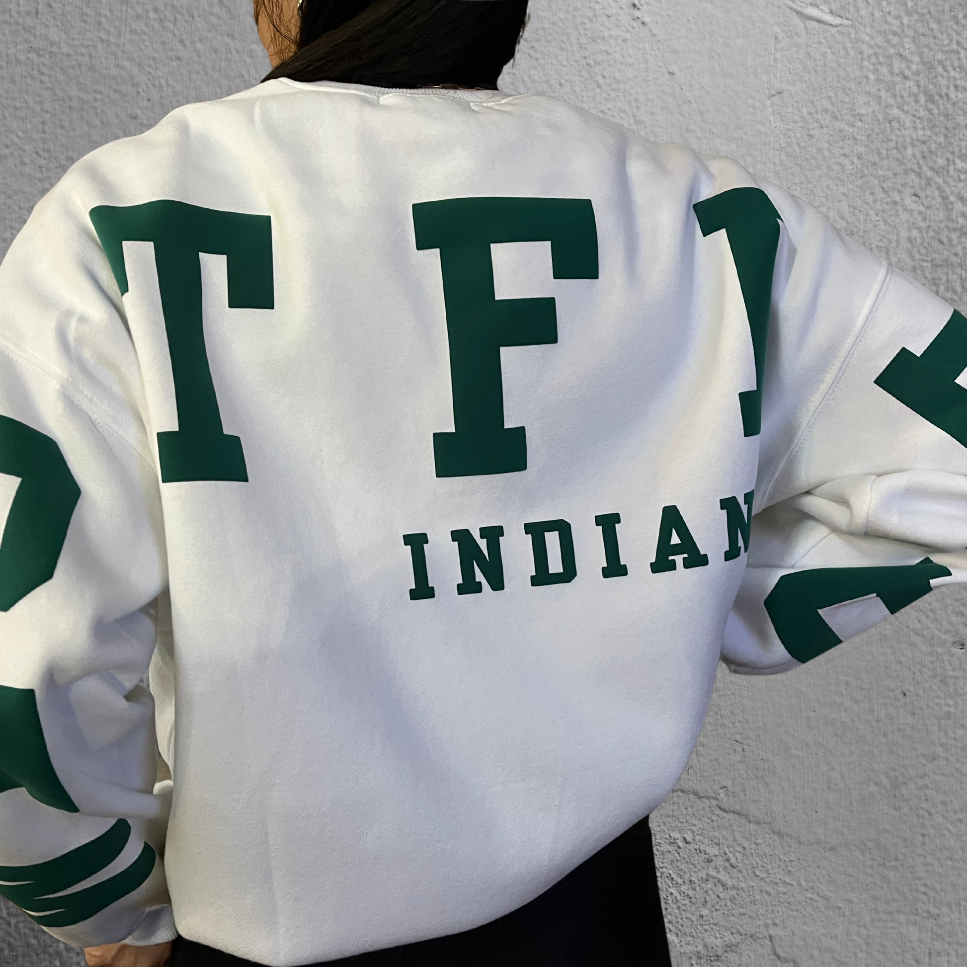 Everyone needs a casual statement piece in your closet. And this is it. Surely to be a fan favorite, this white heavyweight crewneck features oversized WESTFIELD in green puff lettering across the drop shoulder sleeves and back of the sweatshirt. Indiana is also pressed onto the shirt in the same puff (raised) print and color.